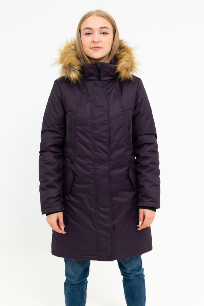 Удлиненная зимняя куртка для женщин прямого силуэта из влагостойкой, дышащей ткани. Отстегивающийся капюшон со съёмной опушкой из искусственного меха. Подкладка из шелка с внутренним карманом на липучке. Центральная молния закрыта планкой на кнопках и липучках. 4 наружных кармана на кнопках. Рассчитана на температуру от -10 до -25.